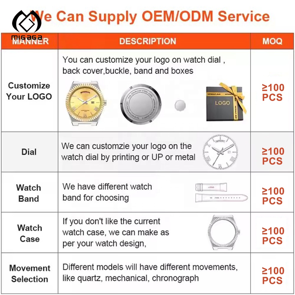 For stock design. our MOQ is 1pcs with original lofo. For logo customized. we usually require MOQ for 10pcs which can mix strap